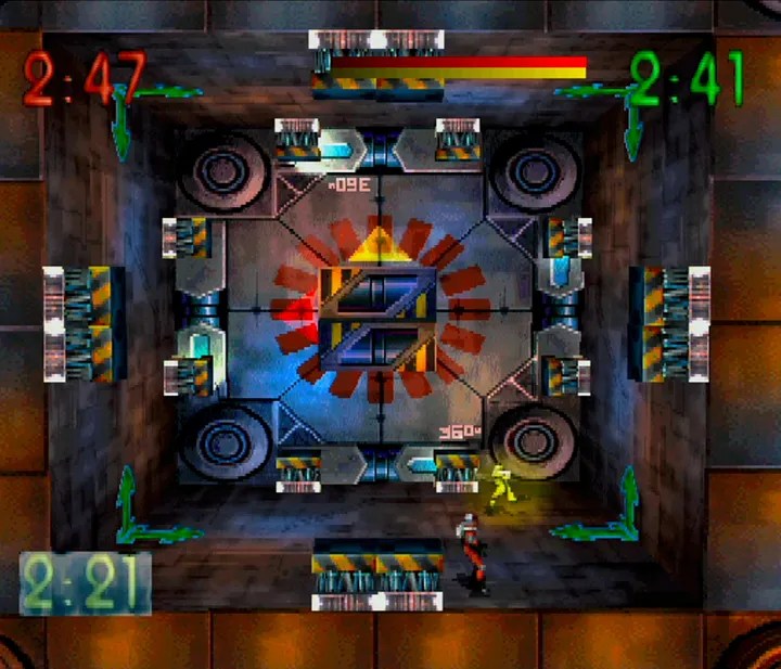 “The thing that puts our sport on the map, folks, is that each chamber is rotatable at the kick of a button! That’s right, you too can be the master of gravity in Blast Chamber! Give one of those green flashing arrows a good ol’ kick and the whole chamber rotates 90 degrees, sending unprepared players falling and leaving them sprawling!”