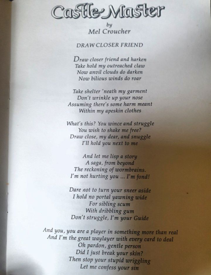 Castle Eternity! Now there’s a name with oomph. Most of the manual is devoted to the backstory of Castle Master, something that intrudes only lightly upon the game itself. Penned by 8-bit computer scene legend and industry pioneer Mel Croucher, Mel weaves quite the evocative tale with a poem that sprawls across twelve A5 pages, all delivered with a menacing undertone. In a 2021 Retro Gamer Magazine interview, Incentive head honcho Ian Andrew (who penned the Driller introduction above) stated that he wanted to add value to Castle Master’s packaging via gothic horror poetry.