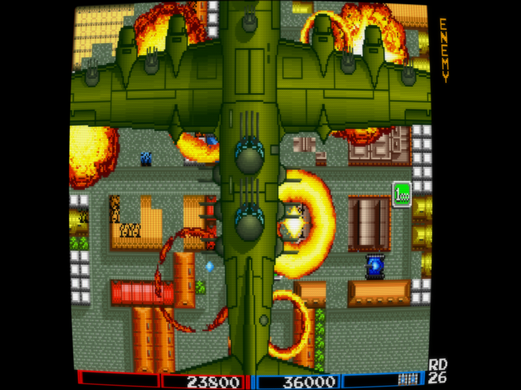 Every few stages, you’ll face a boss. These monstrous engines of war have a few different variations on ‘huge turrets on tracks’ and require different strategies to take down – and sometimes pumping in an extra credit or two! It is an arcade game, after all; gotta munch those quarters!