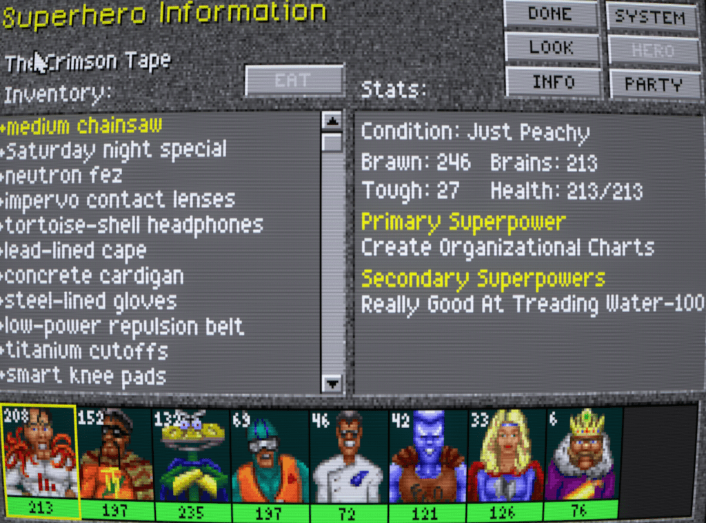 In this world of costumed superheroes, Elvis-worshipping cultists and sentient farm machinery run amok, the player assumes the role of The Crimson Tape, the recently appointed new leader of the small and almost-forgotten Superhero League of Hoboken. Its Superhero League sank into obscurity under the tenure of your incompetent predecessor and is now a mere fourth-rate, level one league. That’s right, the Superhero Leagues have a high-score table and you’re right at the bottom. Way at the bottom.