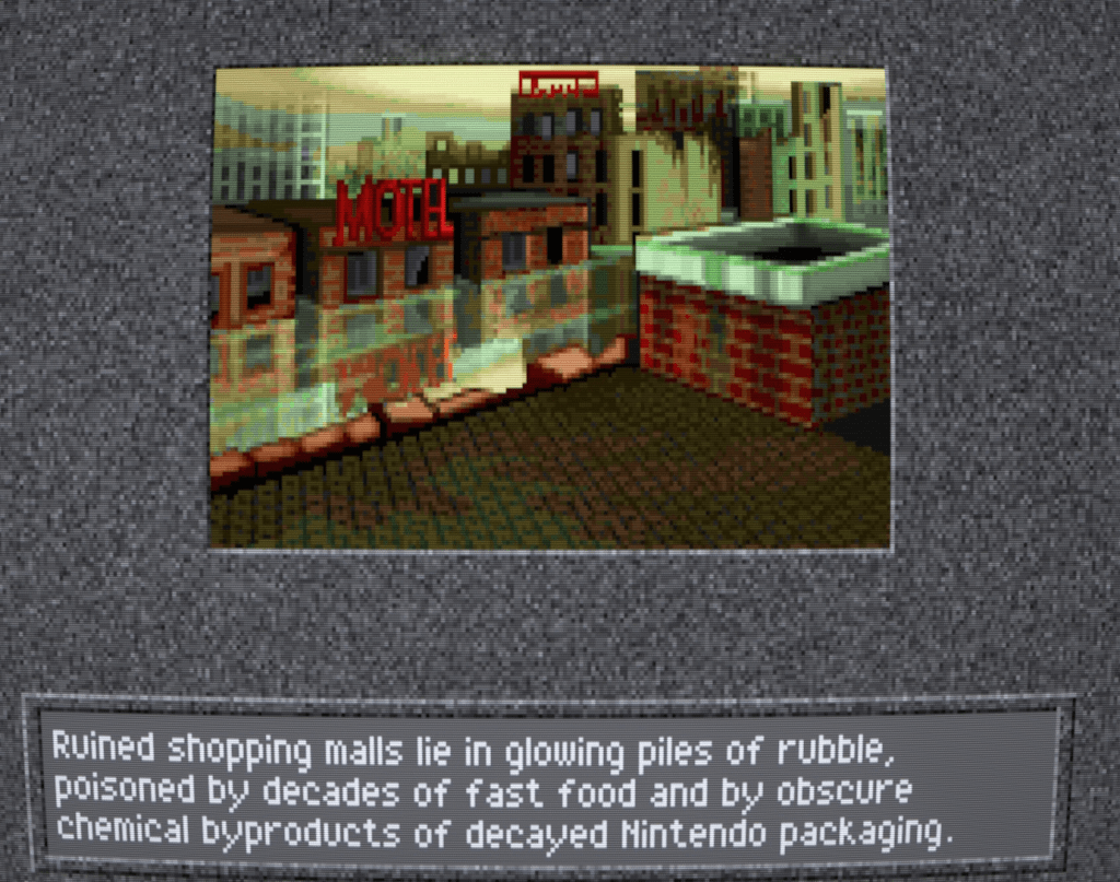 It’s a shame because otherwise, the unique artwork and text descriptors for important zones and landmarks are wonderful. One of my favourites is a church that worships an old mid-90s beige box PC that does nothing but run a screensaver, from which they derive their wisdom and teachings. I’m fond of misremembered history as a post-apocalyptic society trope, so Hoboken rubbed that soft spot in all the right places more than once.