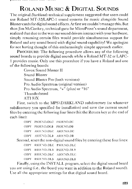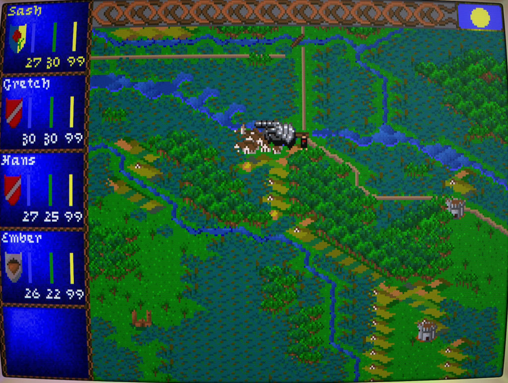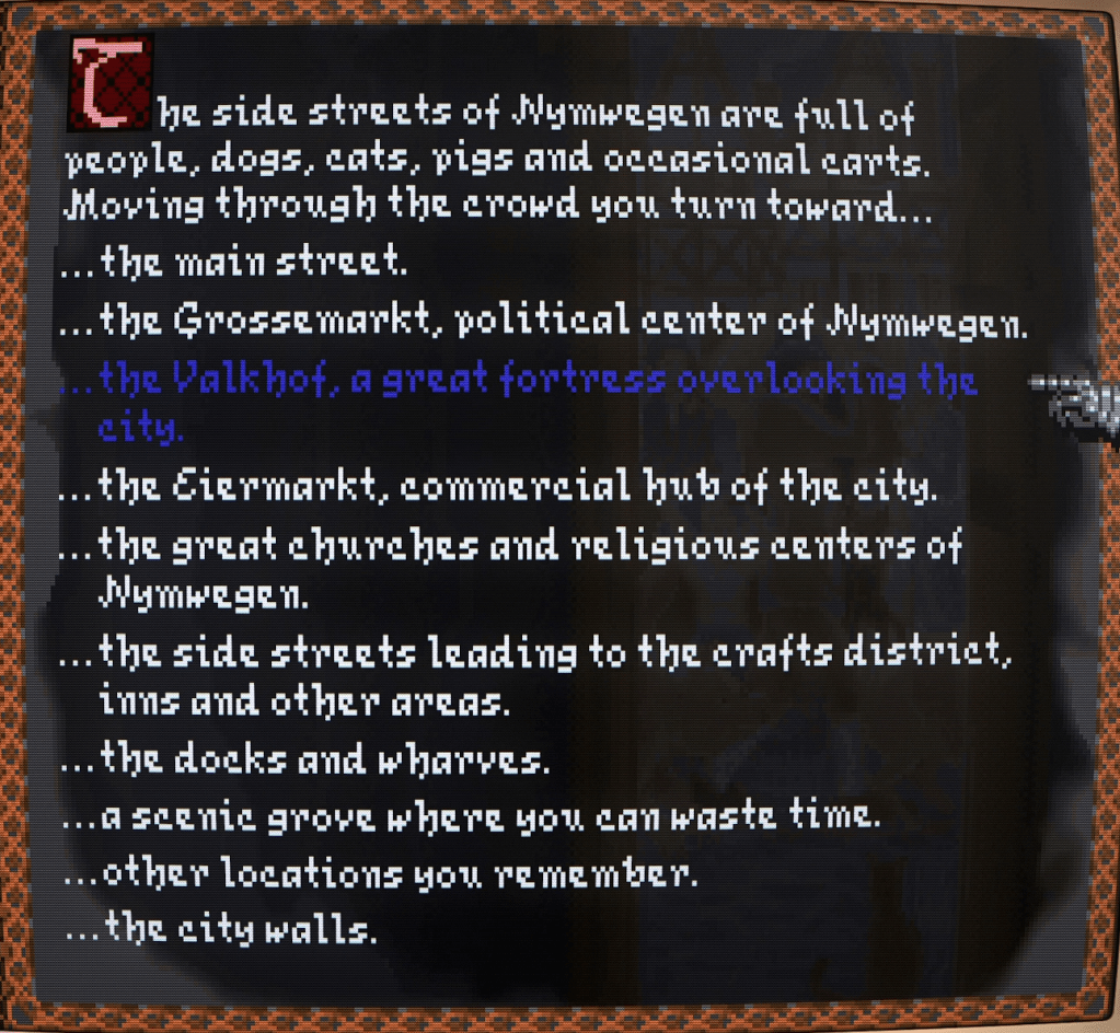 Booting up the GOG release of the game in my own DOSBOX setup (DOSBox PURE in RetroArch), I ran the installation program to tweak the sound options. I was pleased to see it offered Roland MT32 support, one of my favourite things for DOS game audio. Darklands offers both a lovely soundtrack through Roland and (importantly, unless you want various chimes, drums, and wind instruments for SFX!) separate digital sound through Soundblaster or similar hardware. Amusingly, the clue book for the game notes that they discovered how to do this too late to provide comprehensive instructions in the technical supplement bundled with the game. You’re required to tweak the game’s sound file naming structure yourself to enable it.