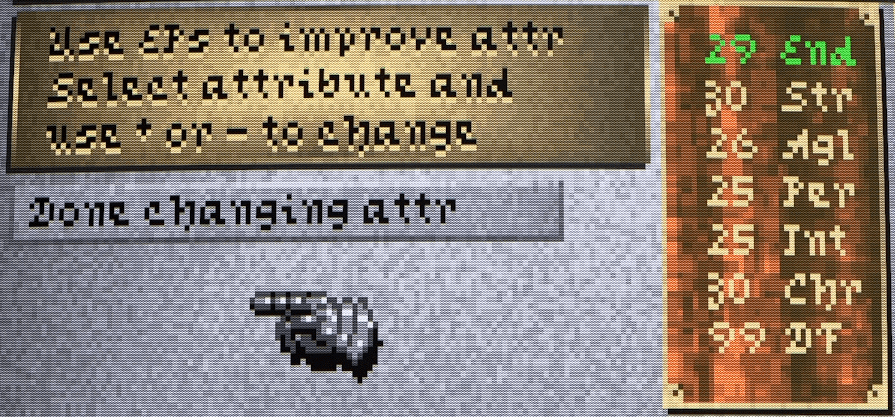 After consulting the manual to learn more about all the stats, skills, and their abbreviations, I decided to give my custom character, Sasha “Sash” Eberhardt, a noble background and boosted her stats to a minimum of twenty-five, raising a few of them to 30+ in line with the military career I had in mind for her.