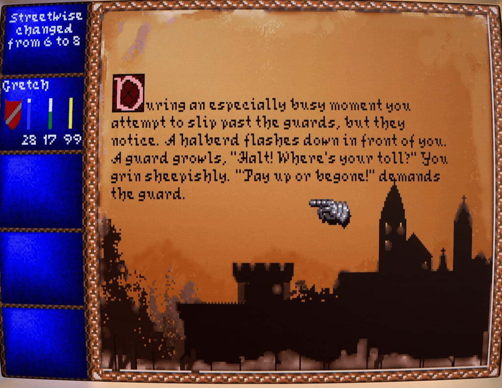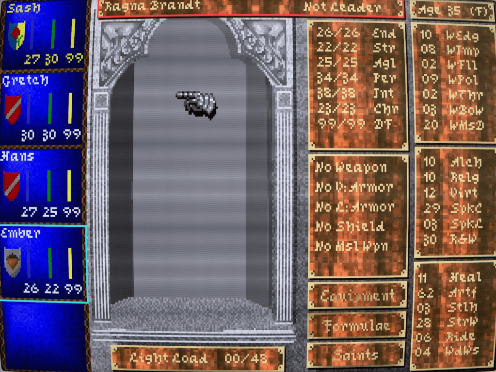 With the stats distributed and with Sasha turning fifteen, old enough to be considered an adult in the medieval world, it’s now time for her to embark on her first profession. At this point, Darklands’ character generation system evoked memories of playing Warhammer Fantasy Roleplay and Traveller. In both TTRPGs, your character isn’t born an adventurer; they gain their skills through having a prior profession before they embark on a life of adventure. In Darklands, you can even have multiple, switching every five years. Or you can specialise in a single one and advance through rank tiers – if you meet the stat, skill, and family background requirements. I had a military career in mind for Sasha, so first took Noble Heir, then Soldier, followed by Veteran, and then finally Captain. This brought Sasha up to 40 years old.
