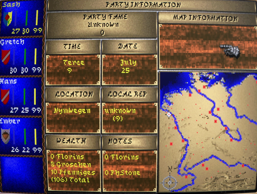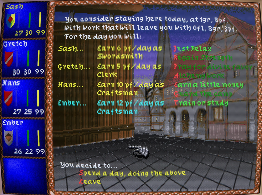 I really enjoyed our first experience with Darklands; there’s definitely something special about the game. It’s bursting with opportunities to spin your own narratives like the ones Kit and I enjoyed thanks to its sandbox nature and just how many little systems are in play. But it is an intimidating game. You’re left as clueless about what to do first as you really might be if you decided to just embark on a life of a freebooting fortune-seeker then. Opportunities aren’t just going to fall into your lap, nor is a king or lord suddenly going to call you to service. You’ll have to work your way up from the bottom, whisper in the right ears, put the coin in the right hands, and build a reputation. In this way, it’s similar to other sandbox MicroProse games such as Sid Meier’s Pirates! or their flight sims where you earn ranks and medals throughout dozens, perhaps hundreds of missions.