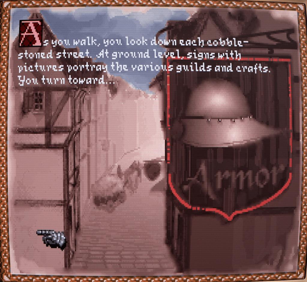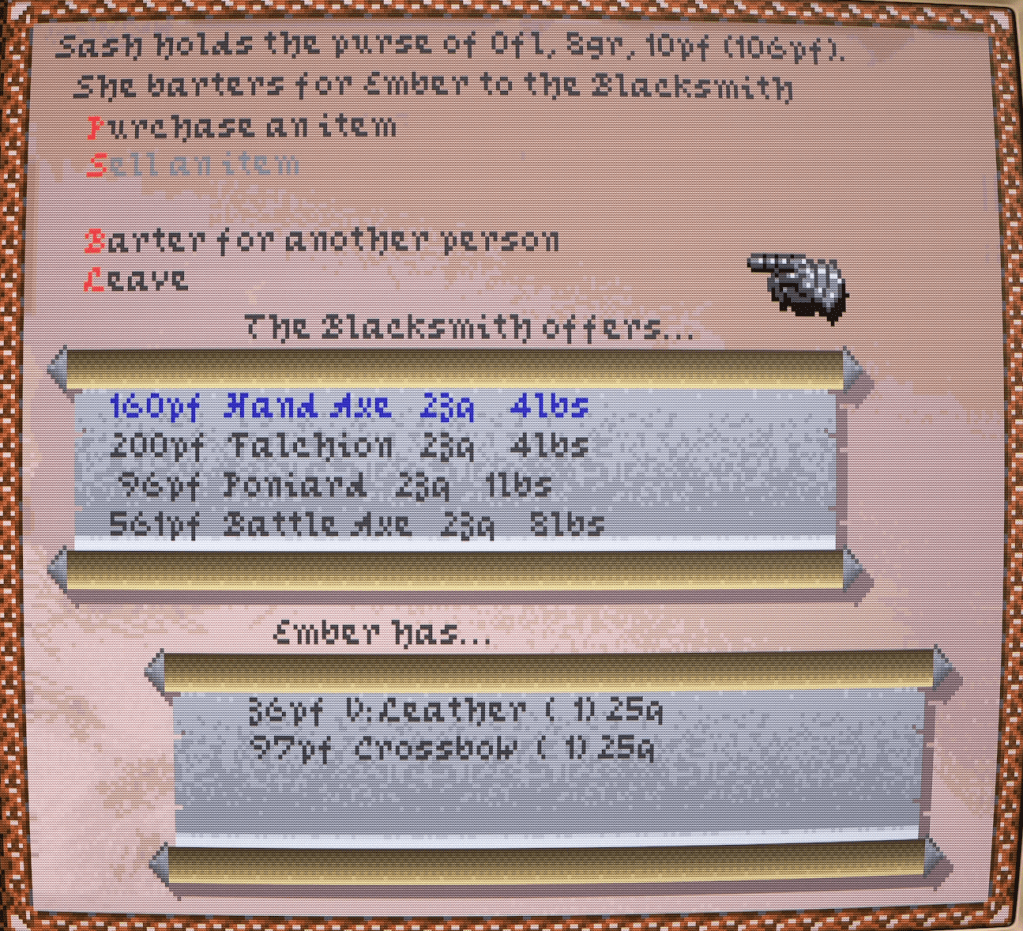 Alas, their combined purse (holding coins of three denominations) was too slender to enable such an upgrade, even with flattering the city’s smithy with flowery words and small talk. So, much to his annoyance (and our own), we left empty-handed.