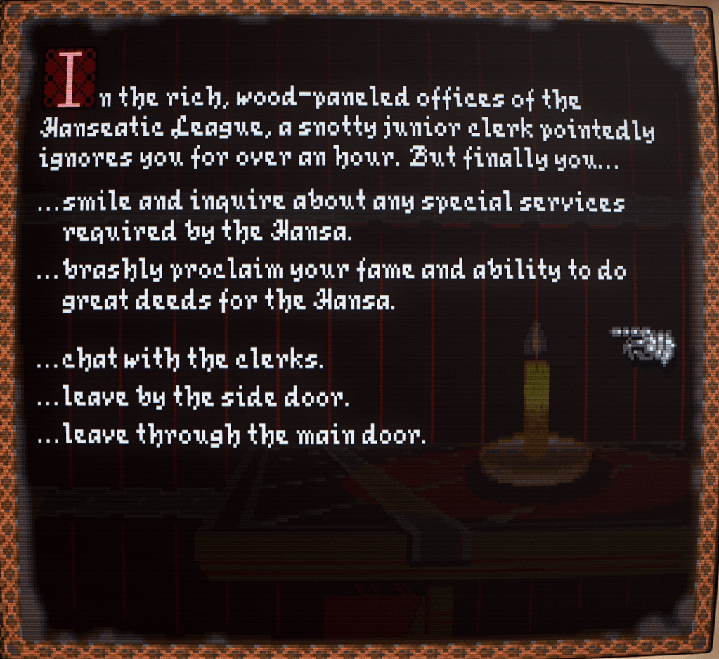 The Eiermarket beckoned next, the bustling commercial hub of the city. It was then that Gretch made the suggestion that we visit the local factor for the all-powerful Hanseatic League (which rose again in 2018!). Perhaps we could find employment as caravan guards or bodyguards?