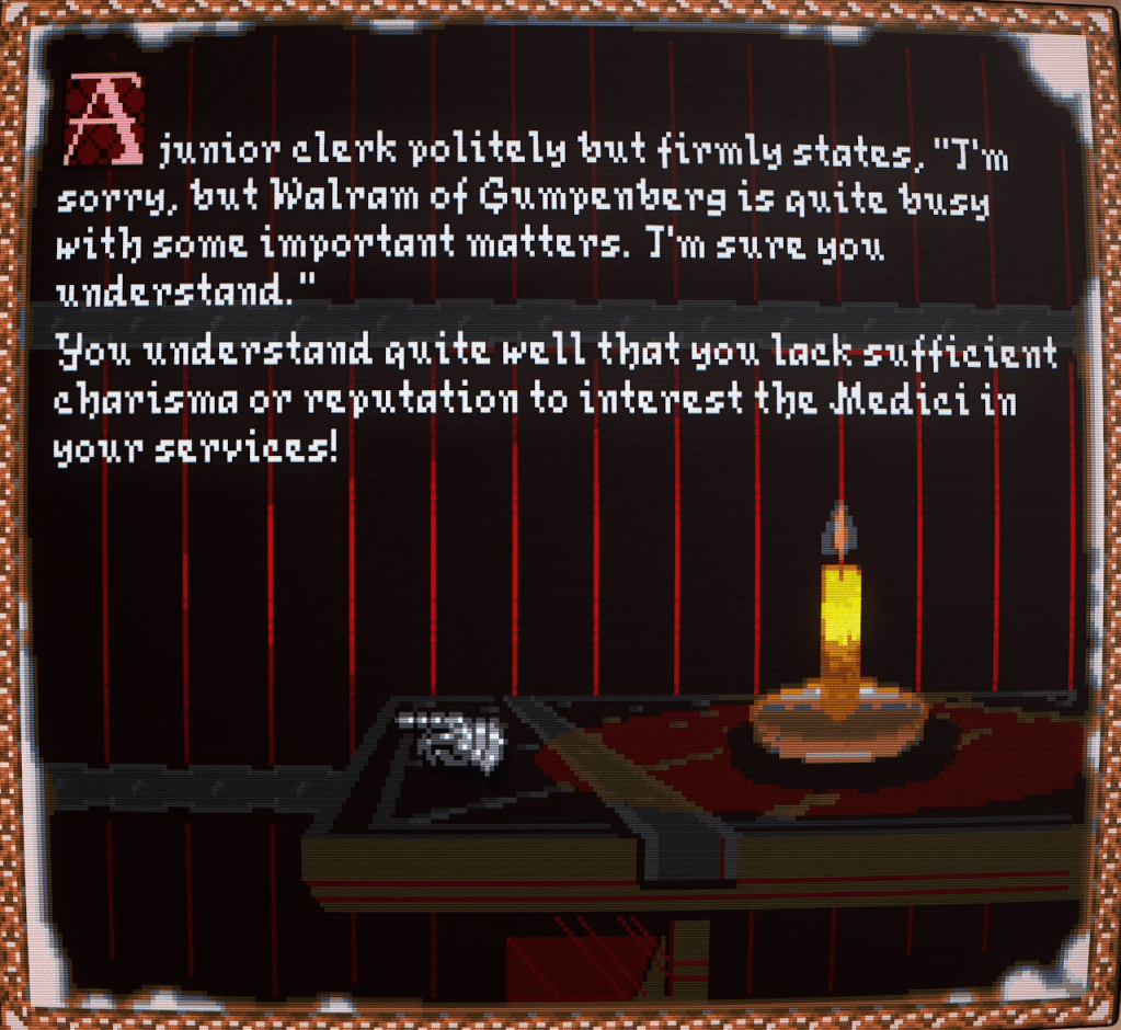 A more polite but still unreceptive experience awaited us at the office of the local representative of the powerful Medici banking family, wasting the rest of the afternoon waiting to be seen.