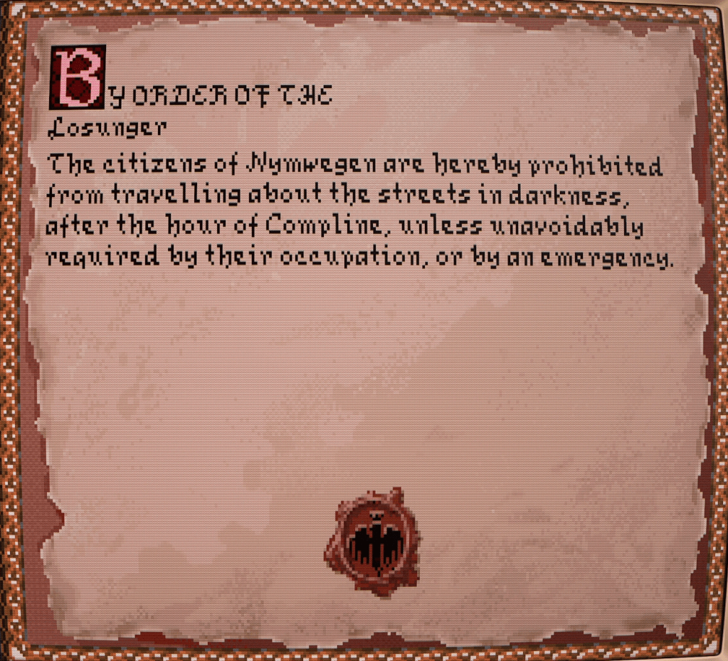 Uh-oh. We had forgotten about the curfew. Citizens of the city are not allowed to be on the streets after the hour of Compline unless they have a damn good reason to be out after sundown. So engrossed had we been reading the many notices posted that it was already dark by the time we looked up again. “What do we do?” asked Sasha in a low whisper. “Well, this would be a good opportunity to seek those footpads,” Ragna murmured, indicating toward Hans.