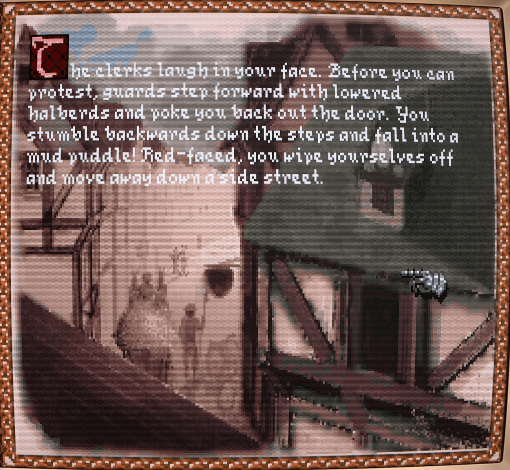 Ill-fortune continued to dog the party as her attempts to play on her noble upbringing fell on deaf and scornful ears. A subsequent attempt to just sneak into the city ended just as poorly.