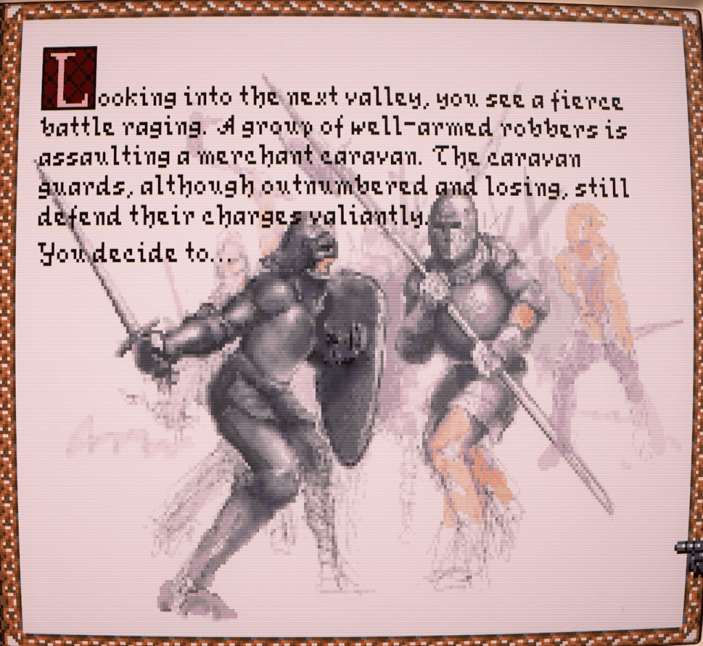 A-ha! A merchant caravan under attack by bandits! Now this was more like it! The party grinned eagerly as they looked at one another, envisioning the thanks they would receive from the beleaguered merchants – and grateful rewards!