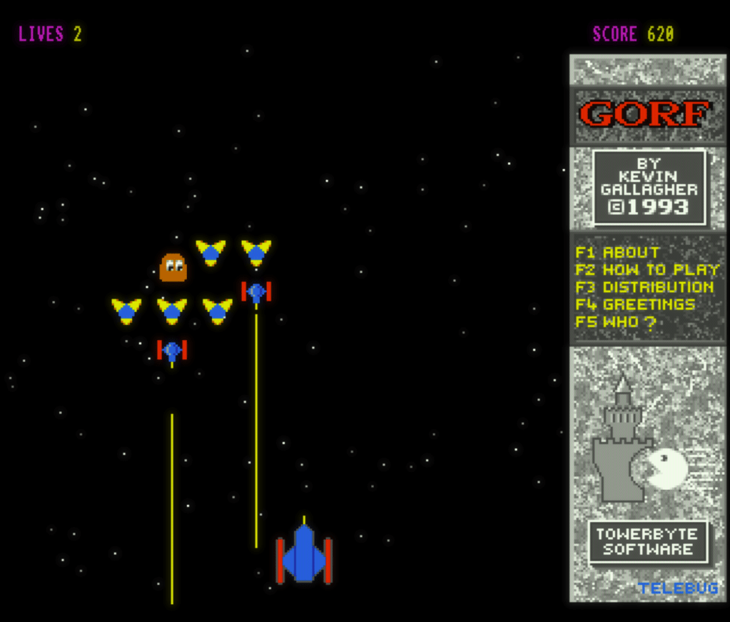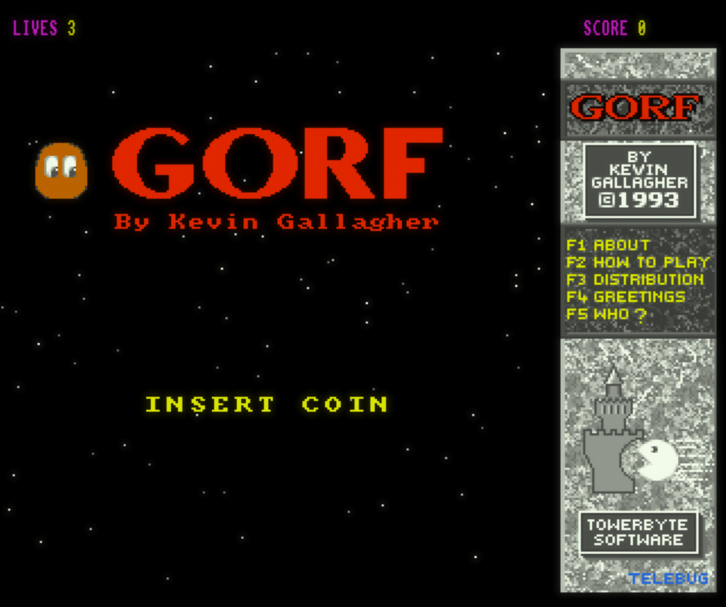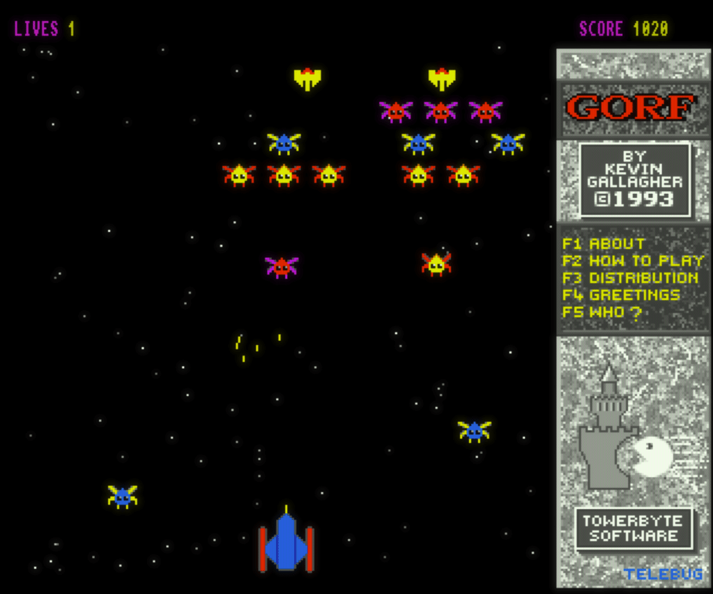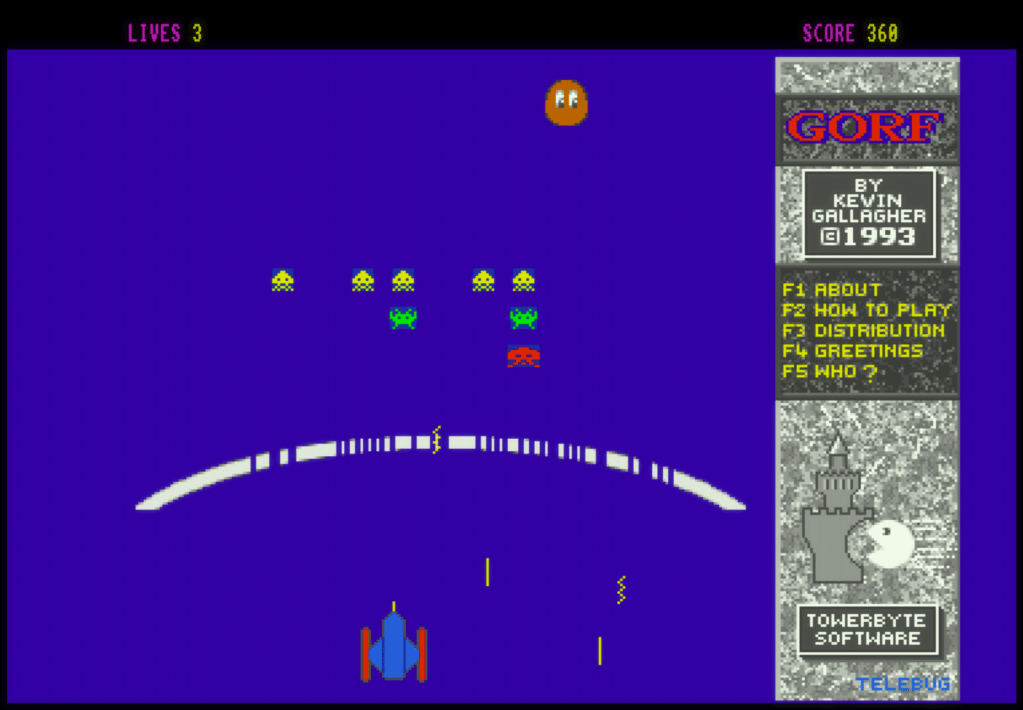 Kevin Gallagher’s GORF is a charming little thing with the kind of presentation flair you can point to as a good example of the PD scene. Just look at that adorable logo with Pac-Man taking a Byte out of a Tower! There are also distribution and greetings screens, giving us a perspective on Dave’s philosophy for how his game was to be shared.