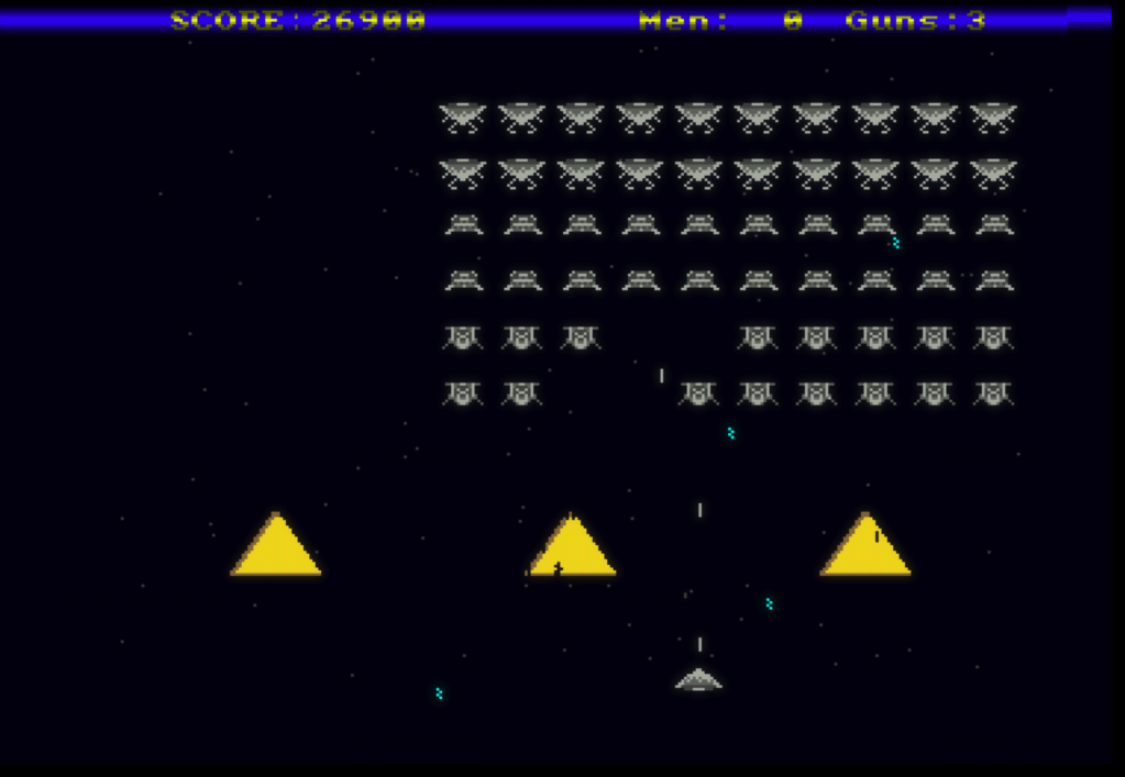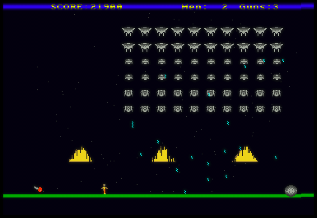 This could be the first bullet hell I ever played. The Invaders will drop a veritable hail of fire down on you, far more than the Taito game it’s based on. All while emitting an intriguing chem/jem chorus of sound while Mr Wobbly is rewarded with a “WOO!” every time he picks up a star. It’s such charming stuff and still very playable with an effective risk-reward mechanic. As with Deluxe Pac-Man, this would have been the closest to Space Invaders I’d played since the Atari 2600 version.