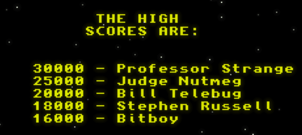 This is easily my favourite of the arcade-inspired PD games I’ve played. Mr Wobbly Legs, named so for his pin-wheeling locomotion, must take on the Spa…I mean, Invaders from Space! But first, and here’s the main deviation from the familiar: he must first earn a promotion to First Class Pilot. He does this by running the gauntlet back and forth, picking up a star on the right and then hitting the lever on the left. All while dodging a fusillade of fire from the Invaders. Once you’ve got your rank-up, you can continue running the gauntlet for as long as you have lives left to pick up power-ups for your ship, such as extra bullets or reducing the cooldown on firing. Then it’s off to traditional blasting!