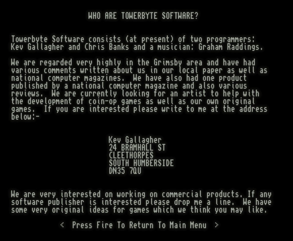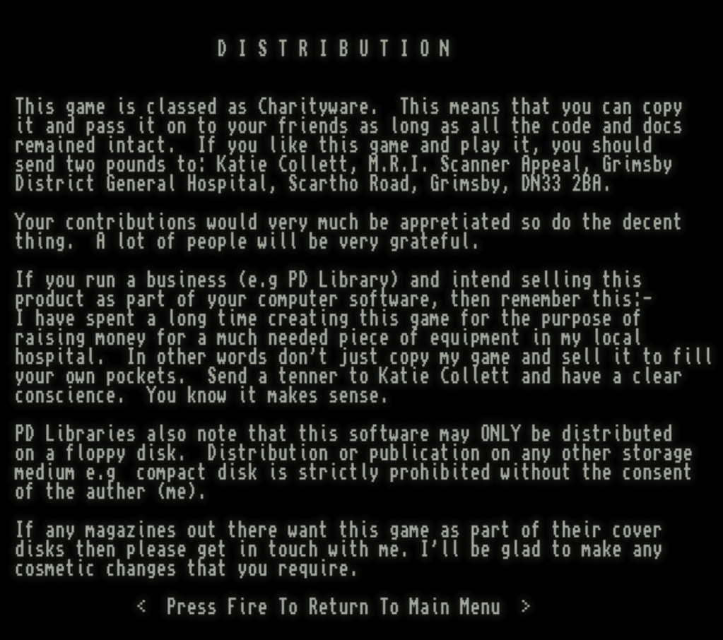 The request to PD game disk distributors not to sell his game purely for their own benefit is something I sometimes see from other PD game creators but mainly demoscene prod crews. Many of those were staunchly against their productions being used for commercial gain at all.