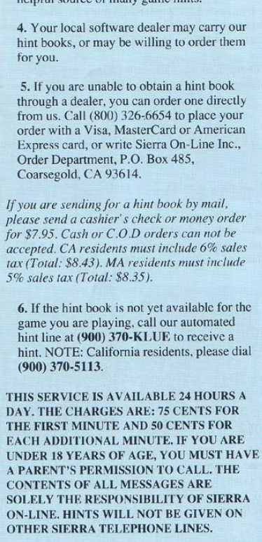 Okay, it’s time to build on my opening criticisms. It’s important to remember that even then, video games were a business. And businesses can get greedy. I feel that greed fuelled some aspects of the clue book market and by extension, hint phone lines. Let’s focus on those for a moment. I’ve not yet confirmed it to be 100% true, but I and others remember hearing that during Sierra’s boom years, Ken Williams mandated that their adventure games should include one puzzle deemed impossible by the playtesters to complete without calling their hint line. And these hint lines were not cheap to call.