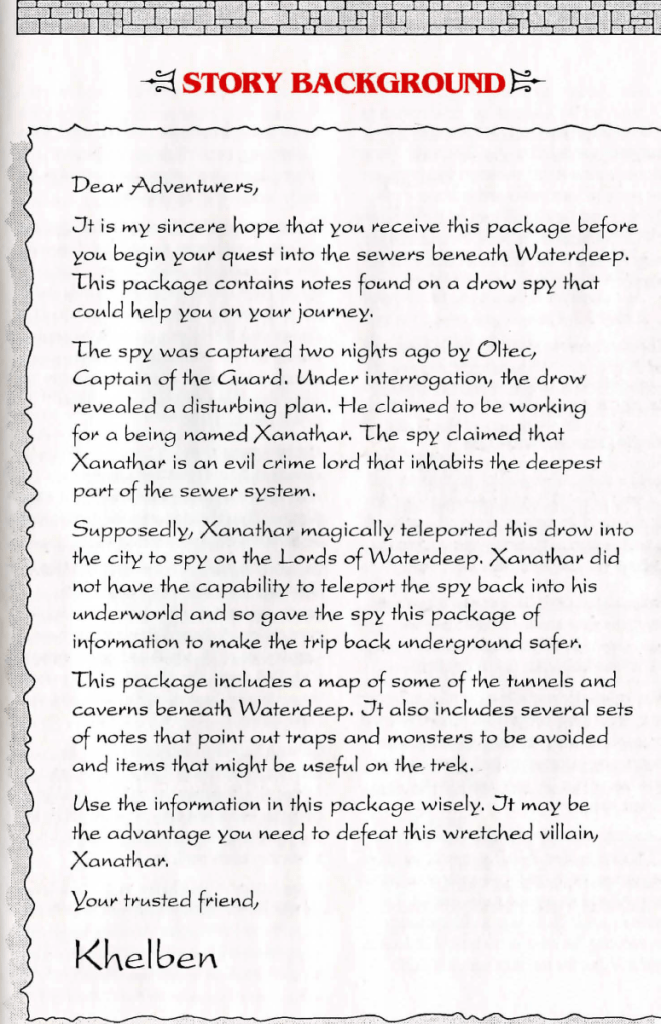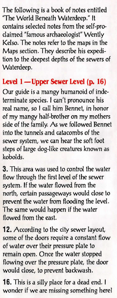 The clue book is introduced by famed archmage Khelben Arunsun, who frames its strategy section as the observations of a drow spy hired by the protagonist of the game. Then as you roll onto the maps and walkthroughs portion, the narrative shifts to the jottings of a somewhat hapless archeologist, Wently, and their hireling, Bennet, as they explore Waterdeep’s sewer system.