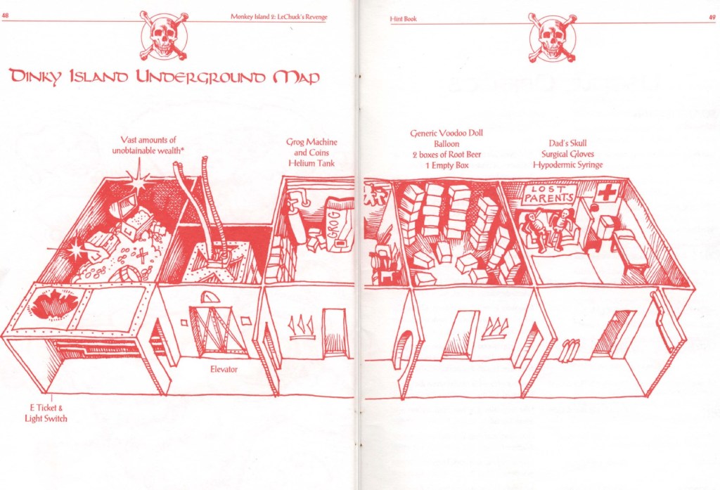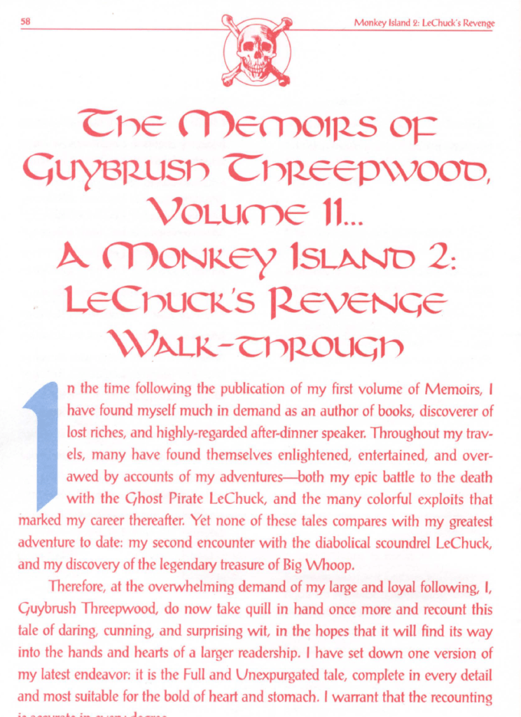 Not only do we get a gentle prod and then a more explicit guidance section for some of its puzzles, but we also get some sweet maps and an isometric perspective illustration of one of its areas! And then, just to put the cherry on the top, a narrative walkthrough of the ‘Regular’ difficulty, framed as Guybrush narrating his memoirs. Lovely stuff and again, recommended reading.