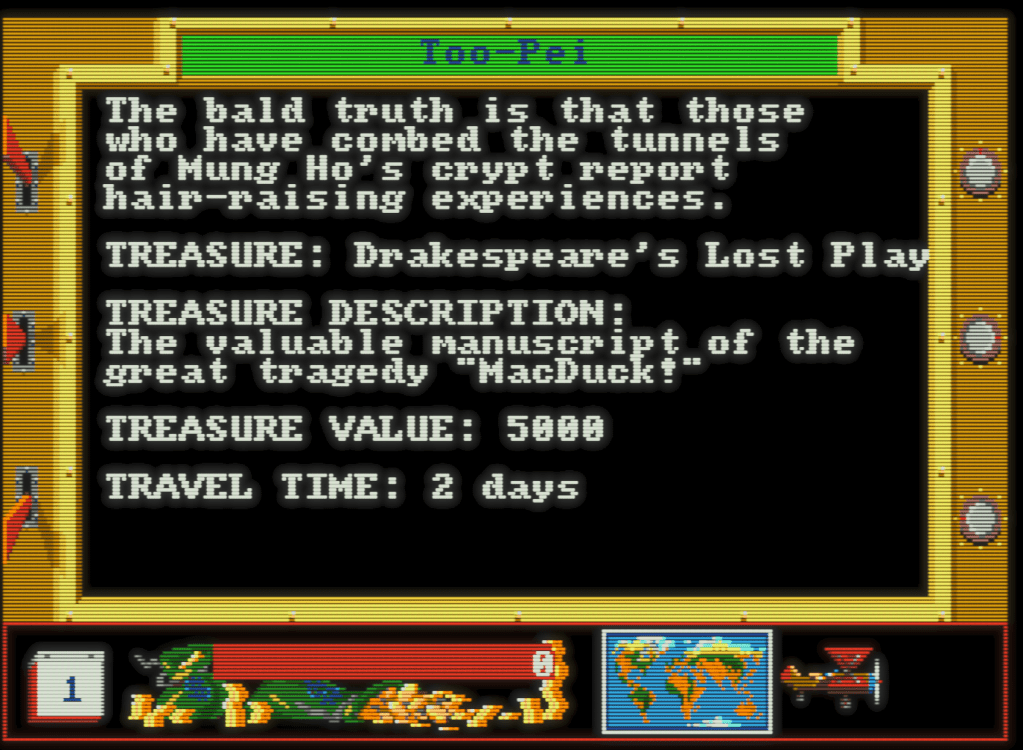 Oof. Too-pei? Drakespeare? Boo! The gentle dad humour continues with the names of the places you can fly to. Each location will take a certain number of days to reach, so time management becomes key. Especially so on harder difficulties, you’ll need to make sure you spend your time wisely to get the most ‘bang for your buck’. The descriptions accompanying each location also clue you in on the type of adventure you’ll have there: Mountain Climbing, Jungle Survival, Cave Exploring, and Nature Photography. And believe me, once you’ve played Quest for Gold long enough, you’ll have a personal sliding scale of which you want to do!