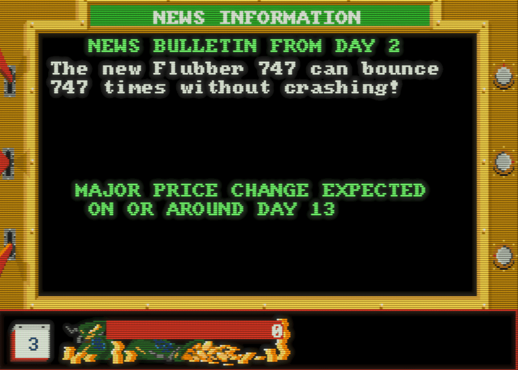 The way that the stock market in this game works, with share growth and fall depicted for the span of the 30 days on the charts above and each company listed as A, B, C, or D, also makes me feel this is additional copy protection against piracy. These aren’t shown anywhere in the game; you’ll have a pretty hard time succeeding in shares otherwise. There are random events that will affect prices to add elements of replayable randomness, some of which are caused by the machinations of your rival, but broadly speaking, you’ll need to check back in on certain days to buy or sell shares according to the charts.