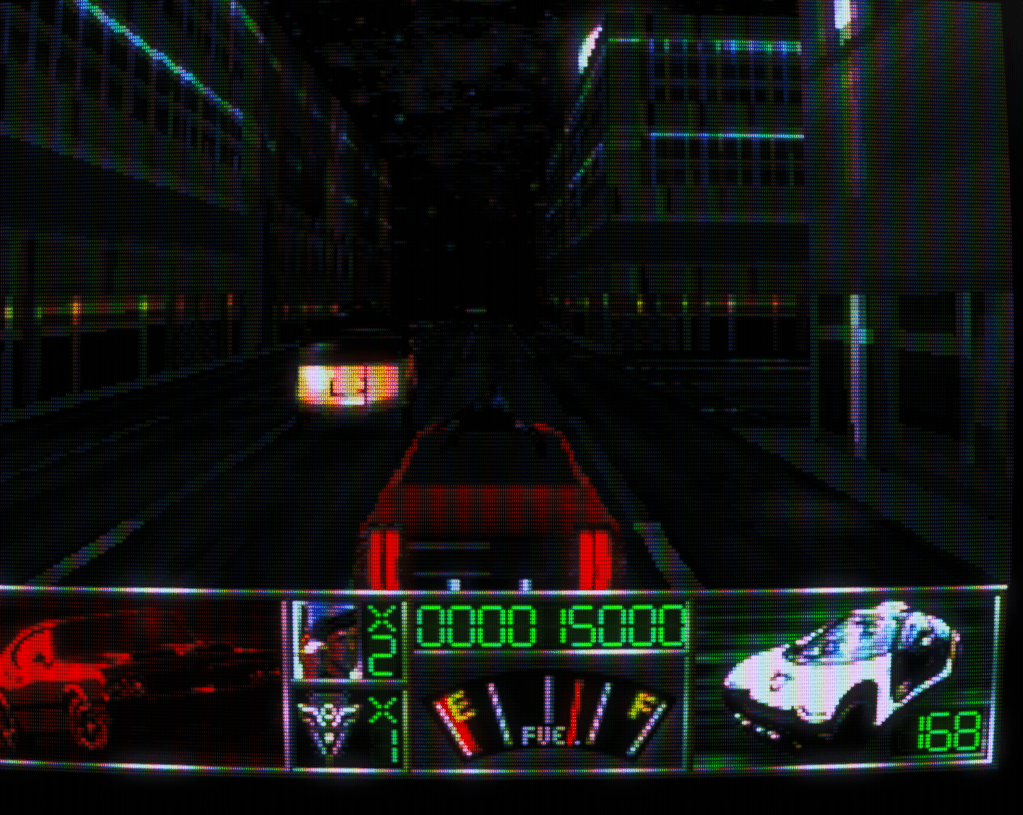 Well, colour me surprised yet again: a car chase section, all done in a 32-bit Road Rash-esque style with polygonal texture-mapped buildings at the sides and boxy vehicles.