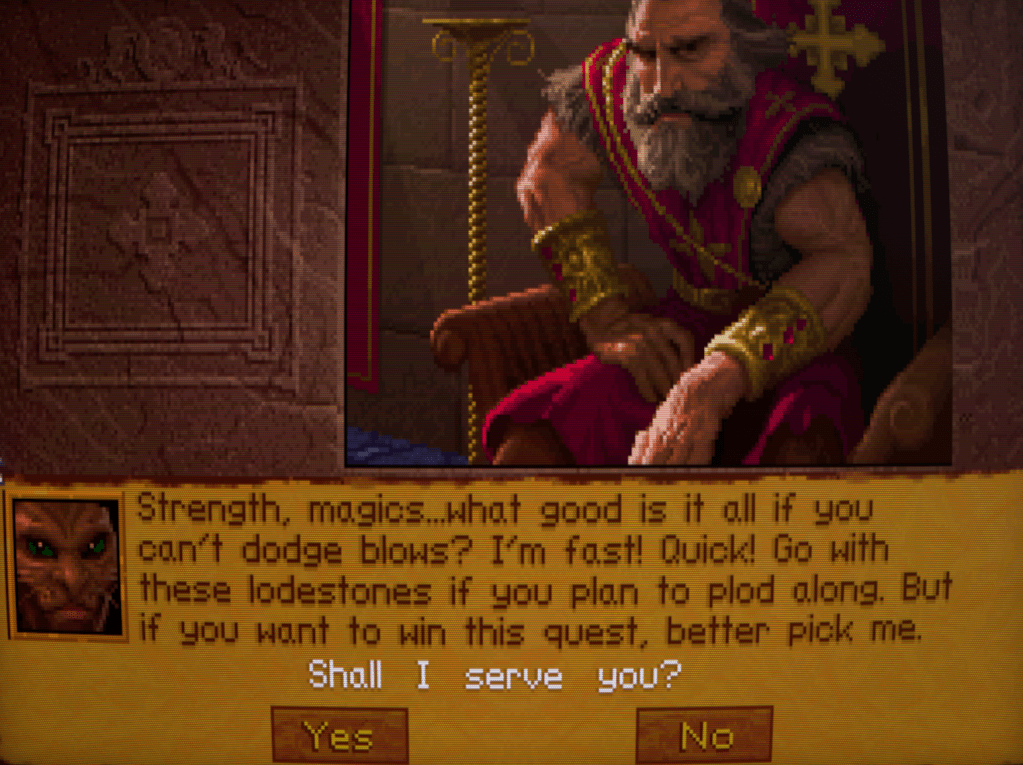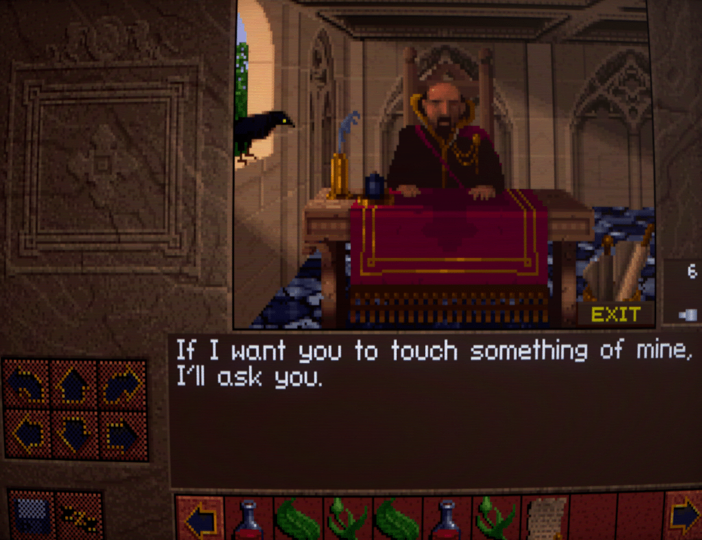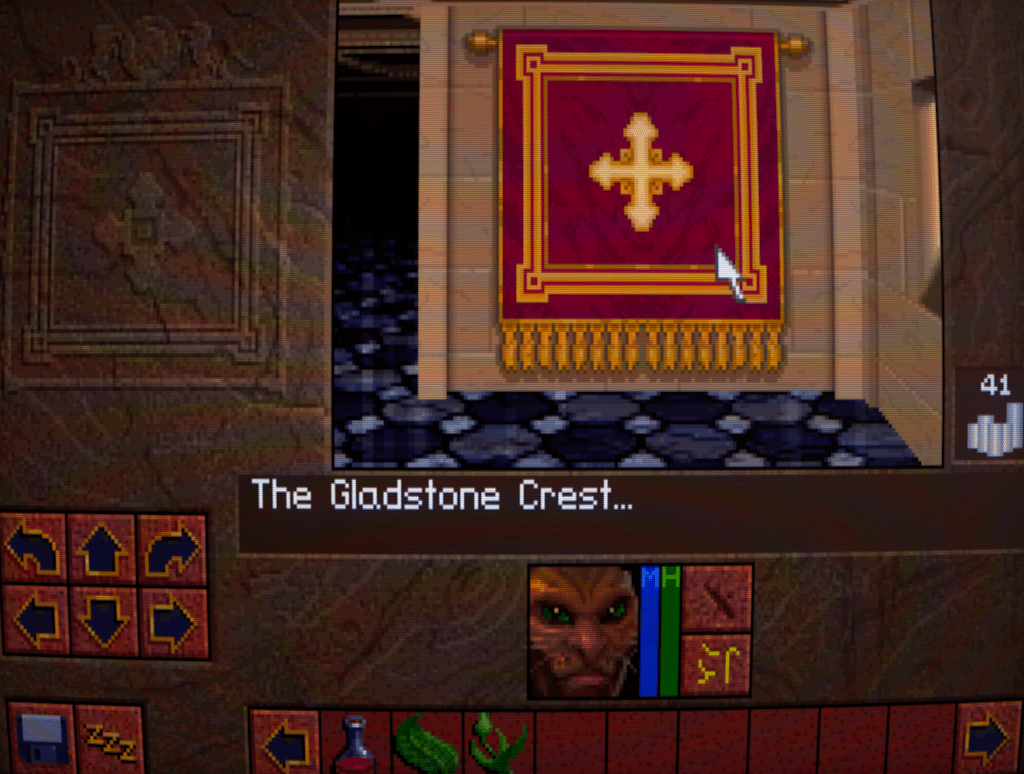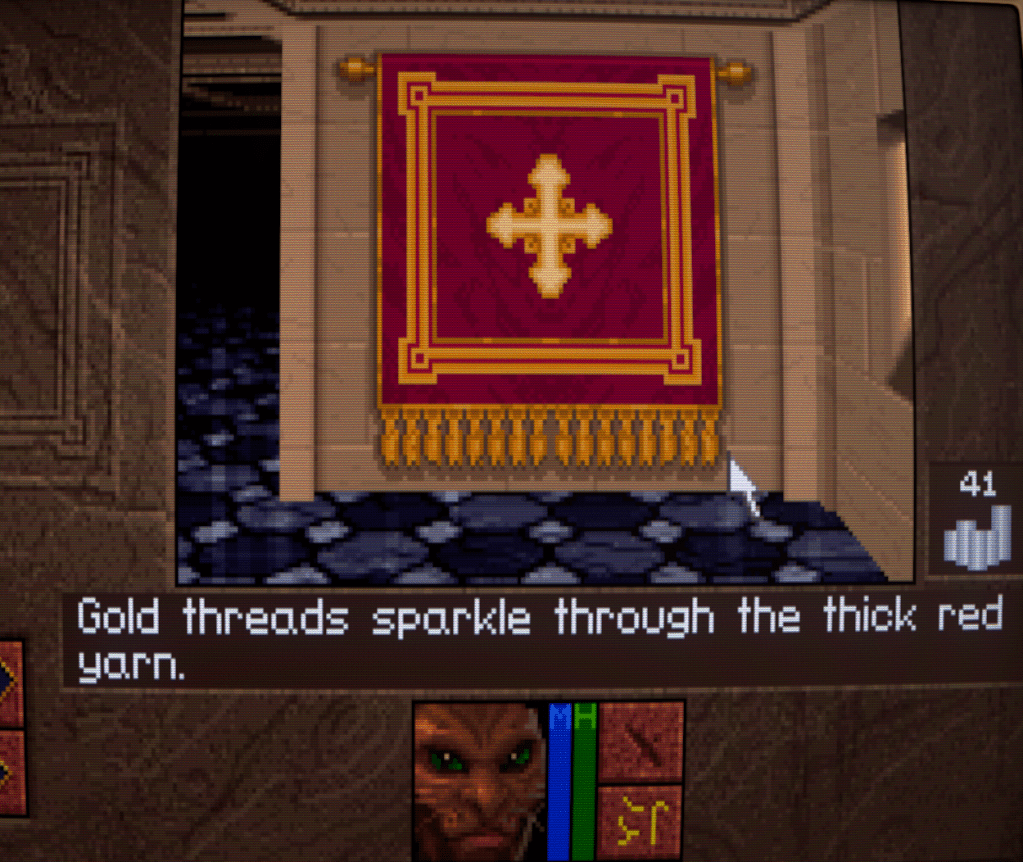 One of the things I enjoy about Lands of Lore is that there are lots of things to click on and get a voice/text line about. And it’s through these that you get little bits of personality from your character. Kieran here identifies it as the Gladstone crest and how that gold threads sparkle in the weaving, whereas I remember Conrad remarking that the old tapestries add a touch of warmth to the castle. Tsk, trust a feline to be attracted to something shiny!