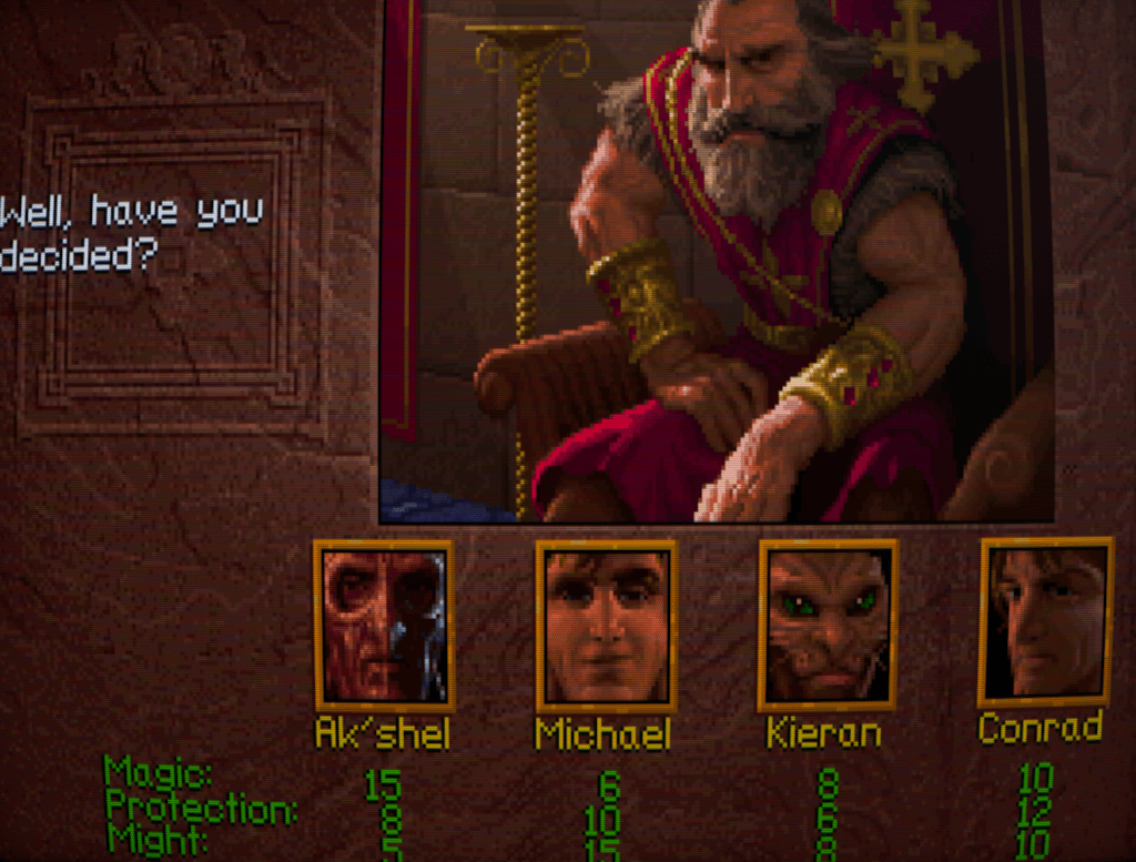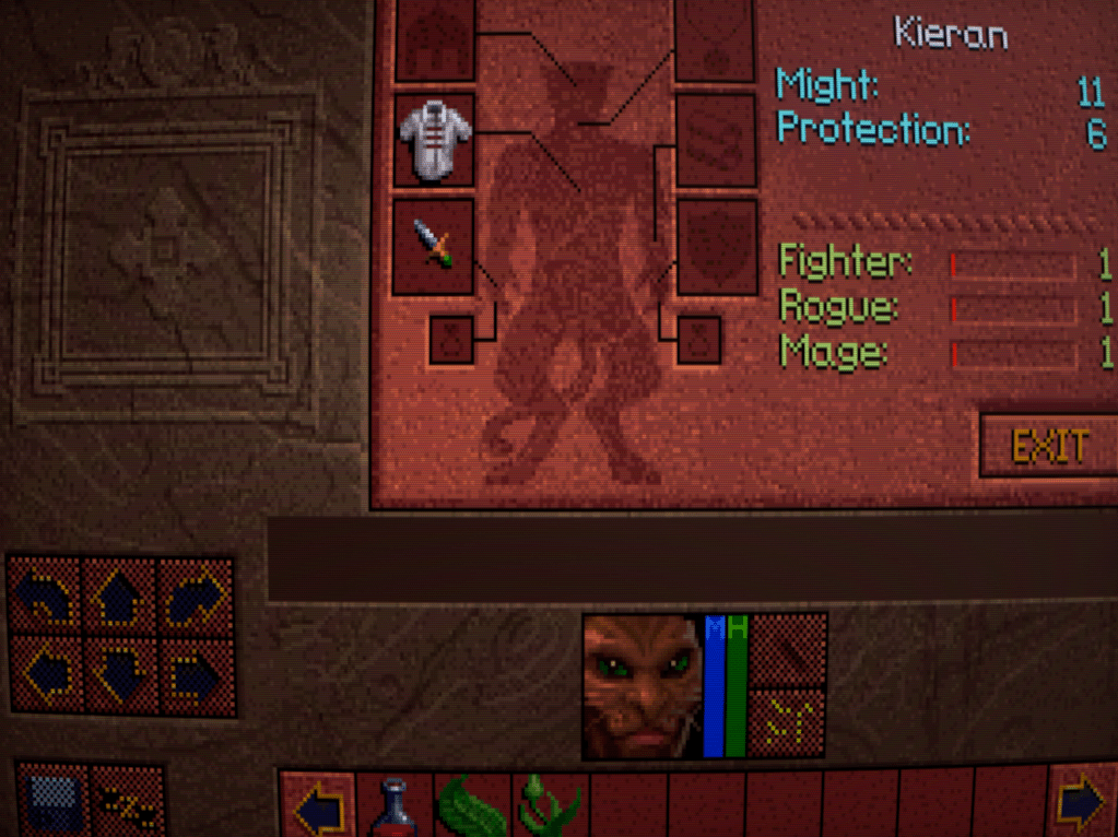 It’s at this point that we’re brought to the character select screen. Unlike the Eye of the Beholder games, you don’t generate a party of characters and their stats, but instead choose from four pre-defined would-be heroes, each with their own personalities and voice-overs. And though Lands of Lore employs a system where all the characters can gain levels in any of three classes, Fighter, Rogue, and Mage, there are still some archetypes here to pick from. The Dracoid Ak’shel favours magic with a huge starting boost to his Magic stat and will gain magic skills at a faster rate than anyone else. His melee combat skills, however, are far weaker. Conversely, Michael favours brawn over brains and his combat skills will improve at an increased rate. Conrad falls squarely in the middle of being a jack-of-all-trades. The feline-faced Kieran, a huline, appears at first to be a weaker version of Conrad, but peeking into the clue book revealed that he will eventually gain an attack speed twice that of everyone else to reflect his natural agility.