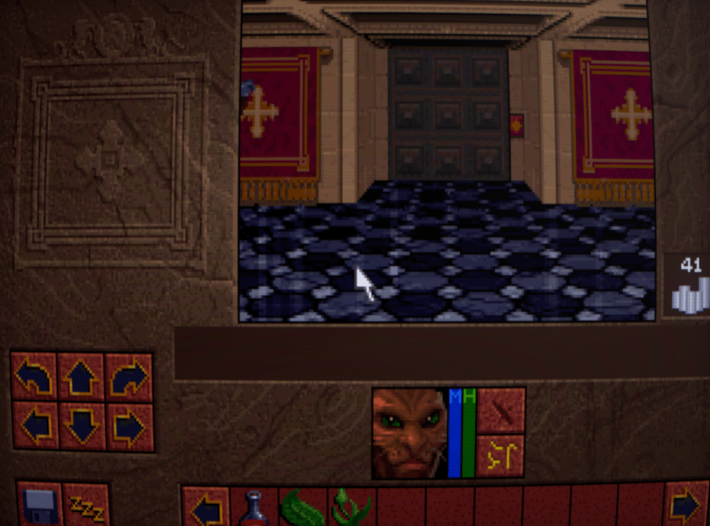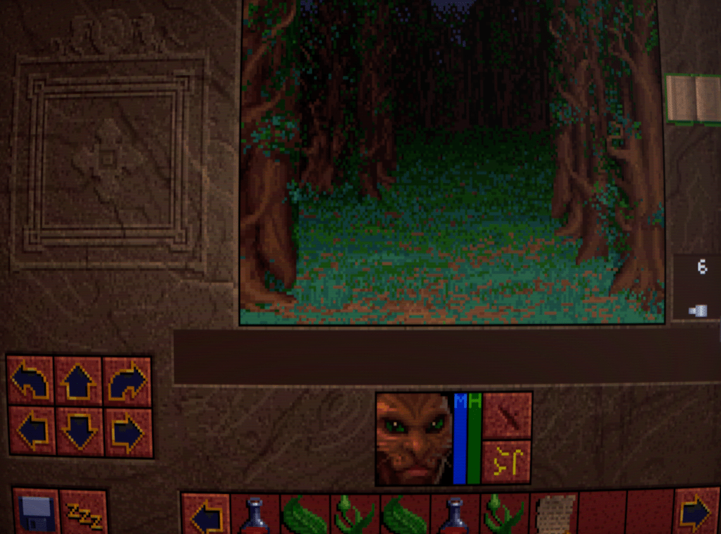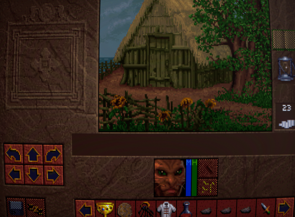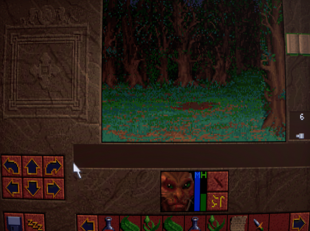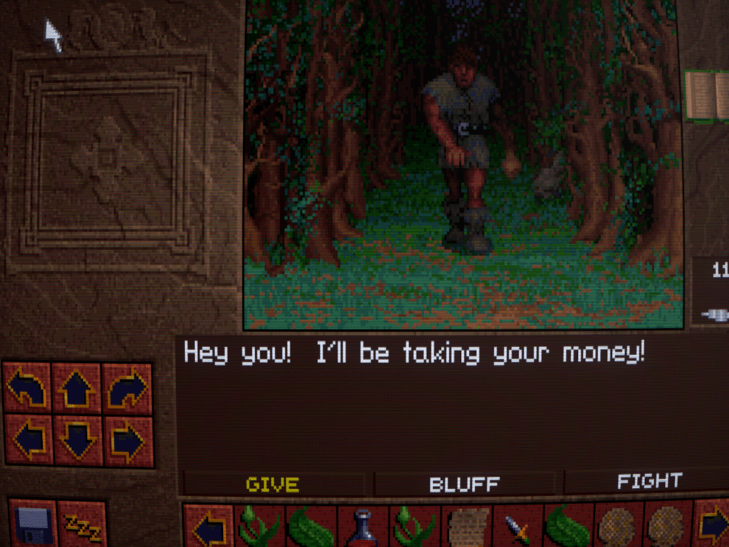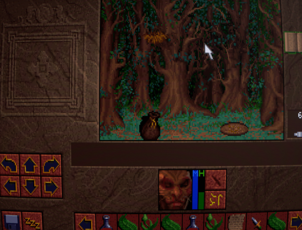 Now we begin to run into one of the issues that Lands of Lore has: inventory management. Rather than a grid system for each character as is customary, LoL has a shared inventory running horizontally across the bottlom of thre screen. This fills up quickly, necessitating a lot of scrolling back and forth with the arrows either side. I honestly don’t think it’s much improved over a separate inventory and grid screen, despite the extra immersion.