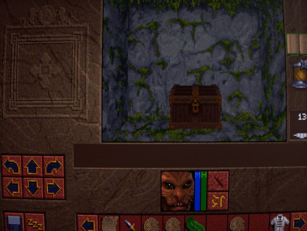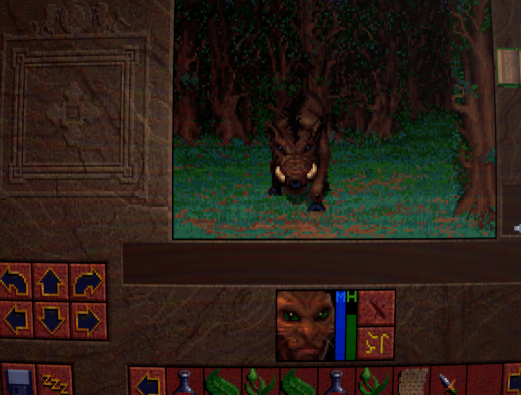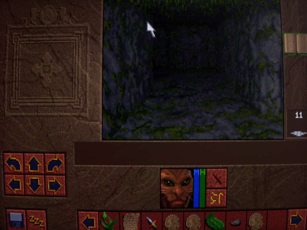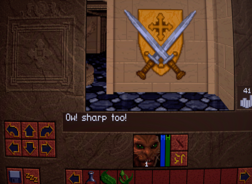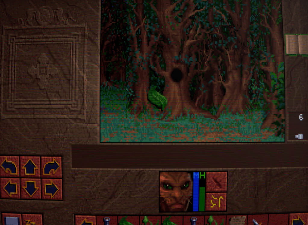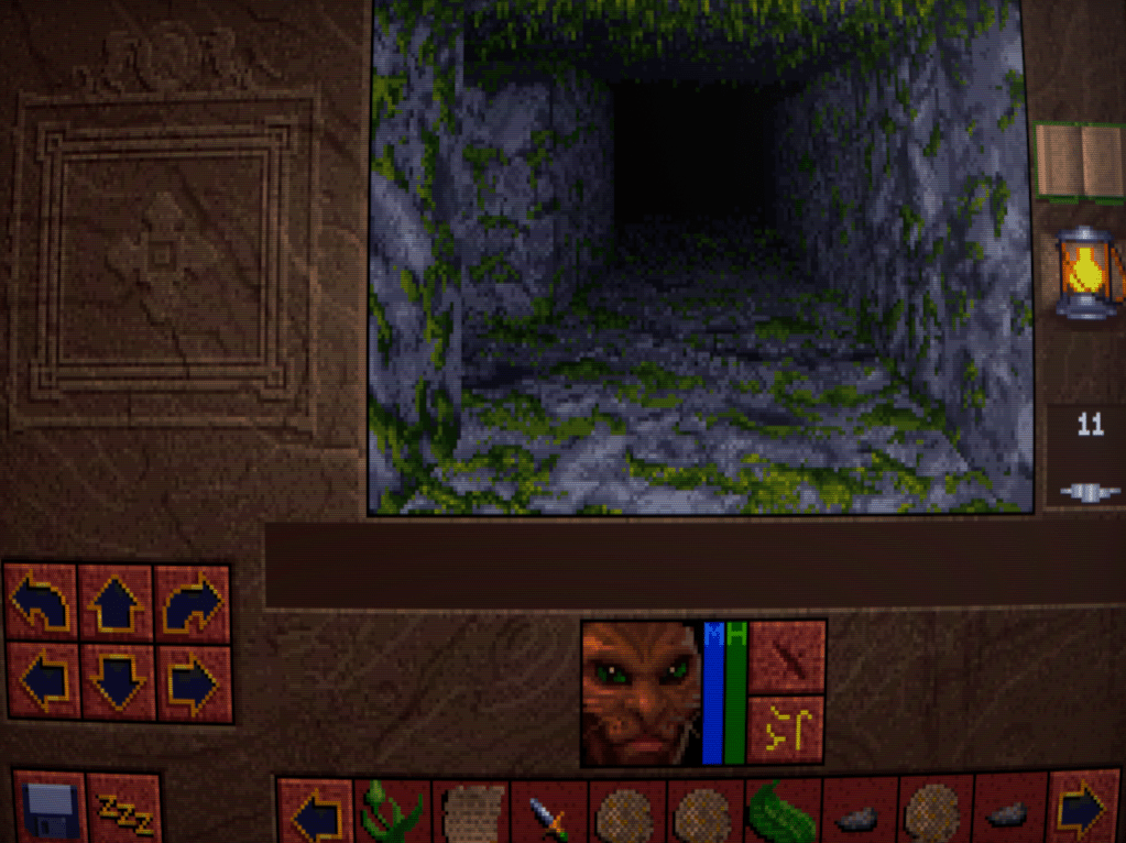 Now we begin to run into one of the issues that Lands of Lore has: inventory management. Rather than a grid system for each character as is customary, LoL has a shared inventory running horizontally across the bottlom of thre screen. This fills up quickly, necessitating a lot of scrolling back and forth with the arrows either side. I honestly don’t think it’s much improved over a separate inventory and grid screen, despite the extra immersion.