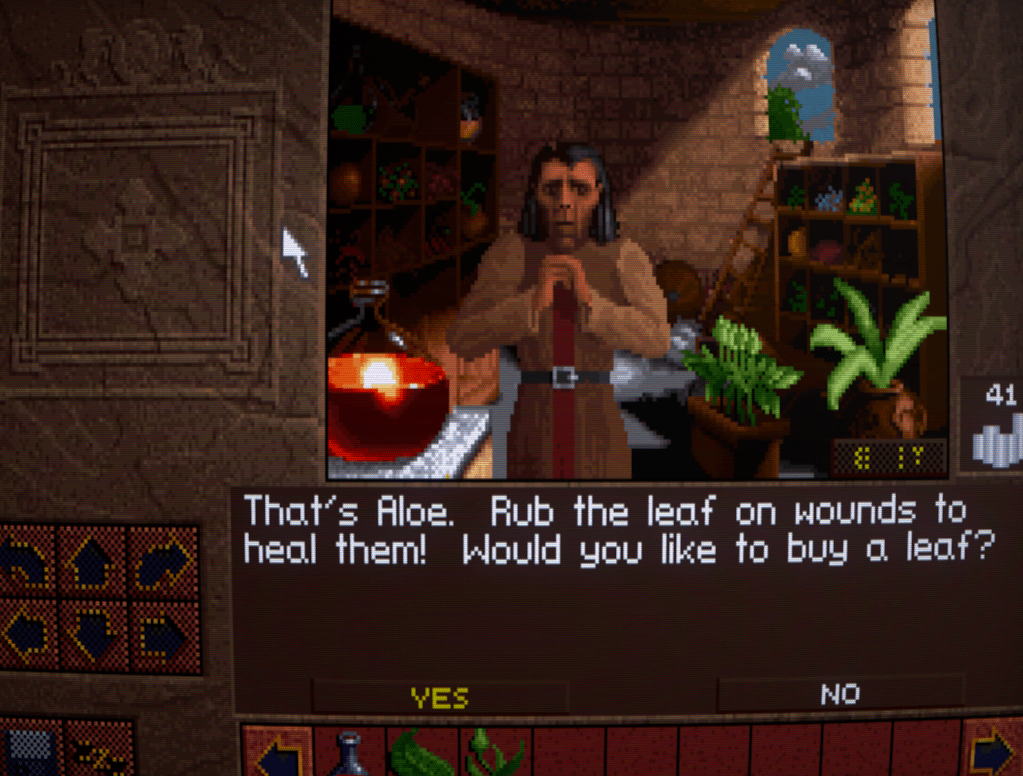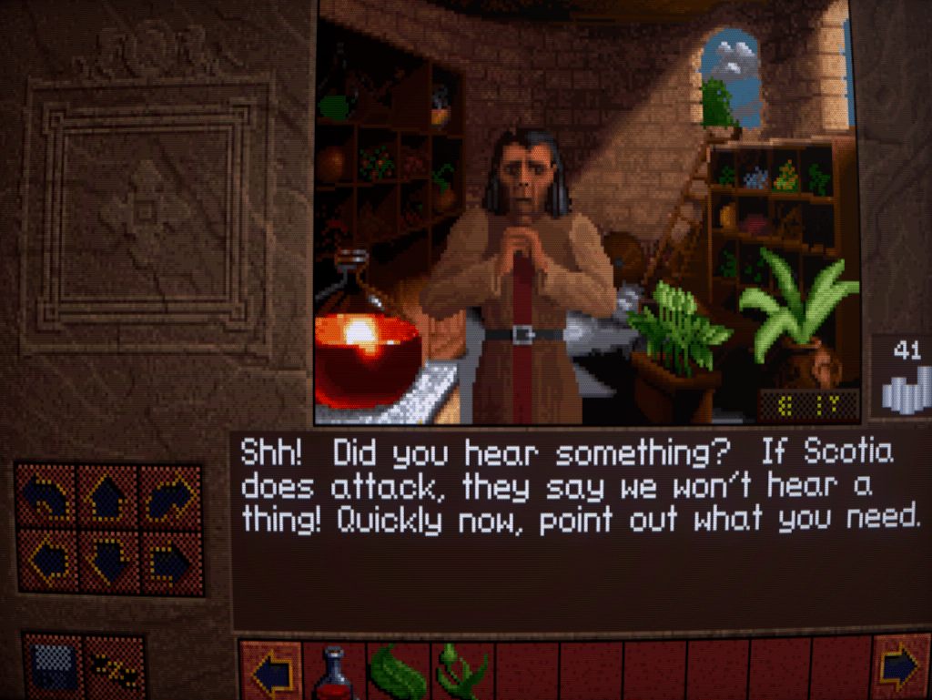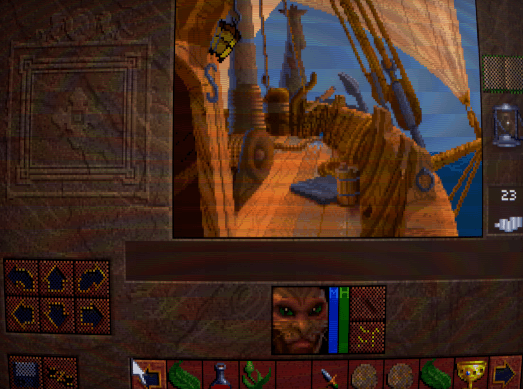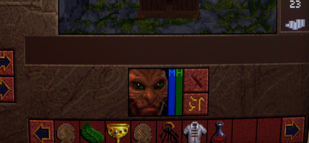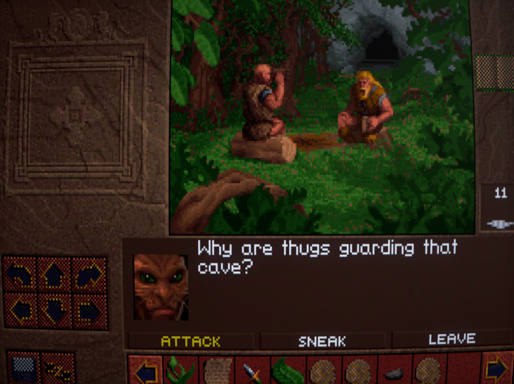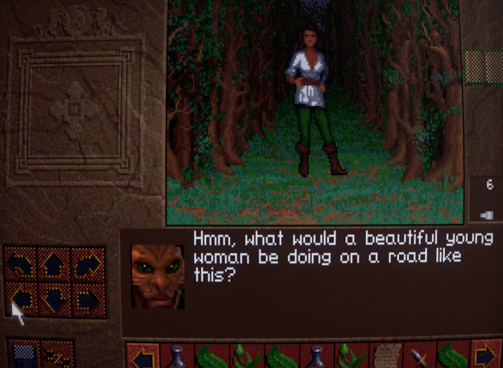 Now we begin to run into one of the issues that Lands of Lore has: inventory management. Rather than a grid system for each character as is customary, LoL has a shared inventory running horizontally across the bottlom of thre screen. This fills up quickly, necessitating a lot of scrolling back and forth with the arrows either side. I honestly don’t think it’s much improved over a separate inventory and grid screen, despite the extra immersion.