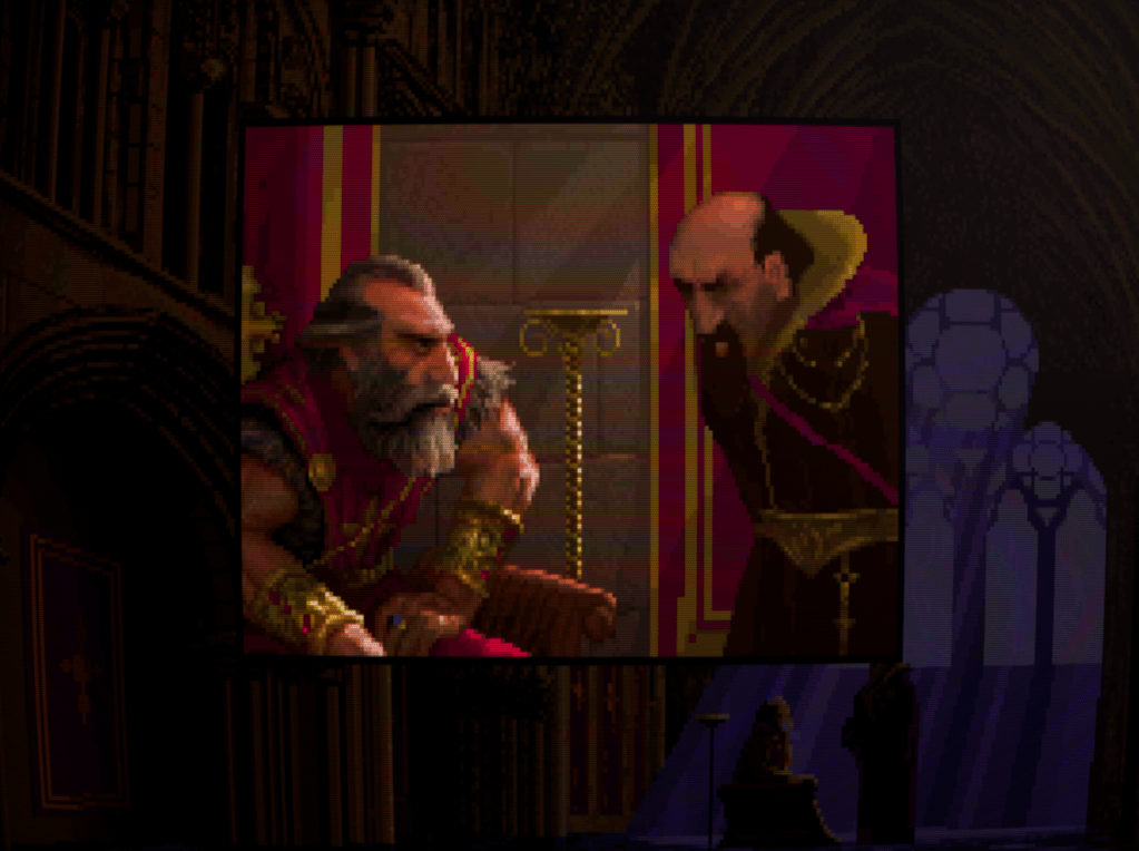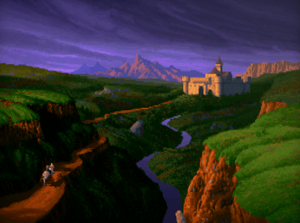 The game kicks off with an intro featuring some truly lovely medieval fantasy VGA pixel artwork. The evil witch Scotia, thwarted once before in her efforts to bring low Gladstone and its ruler, King Richard, now again hatches fresh schemes.