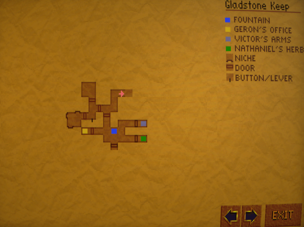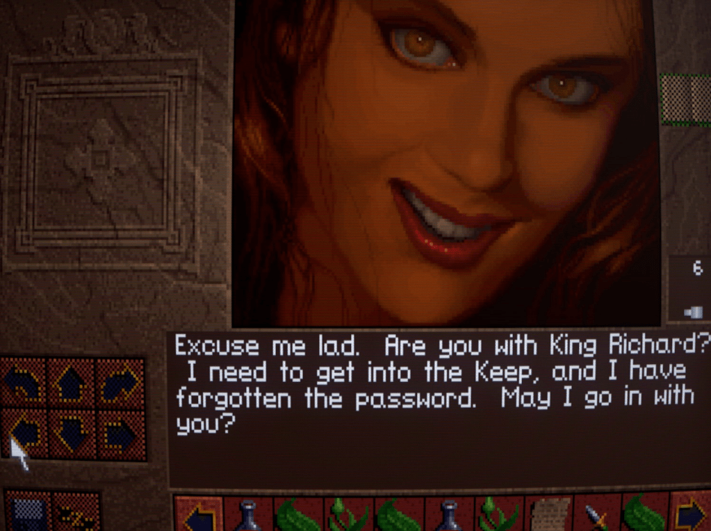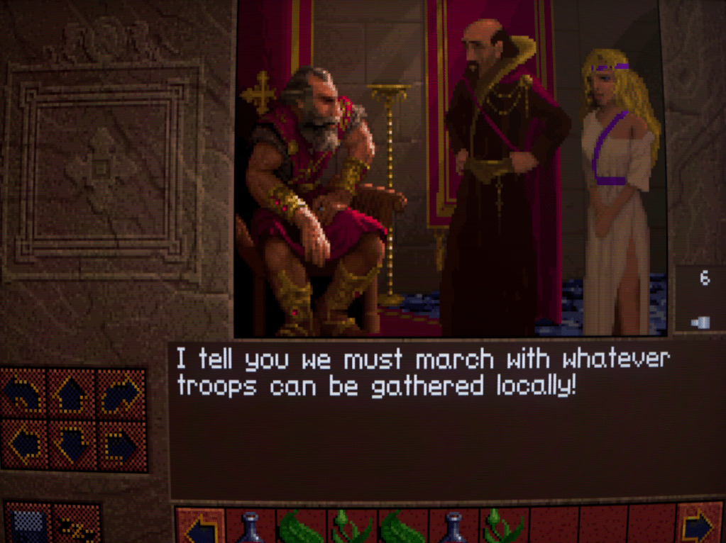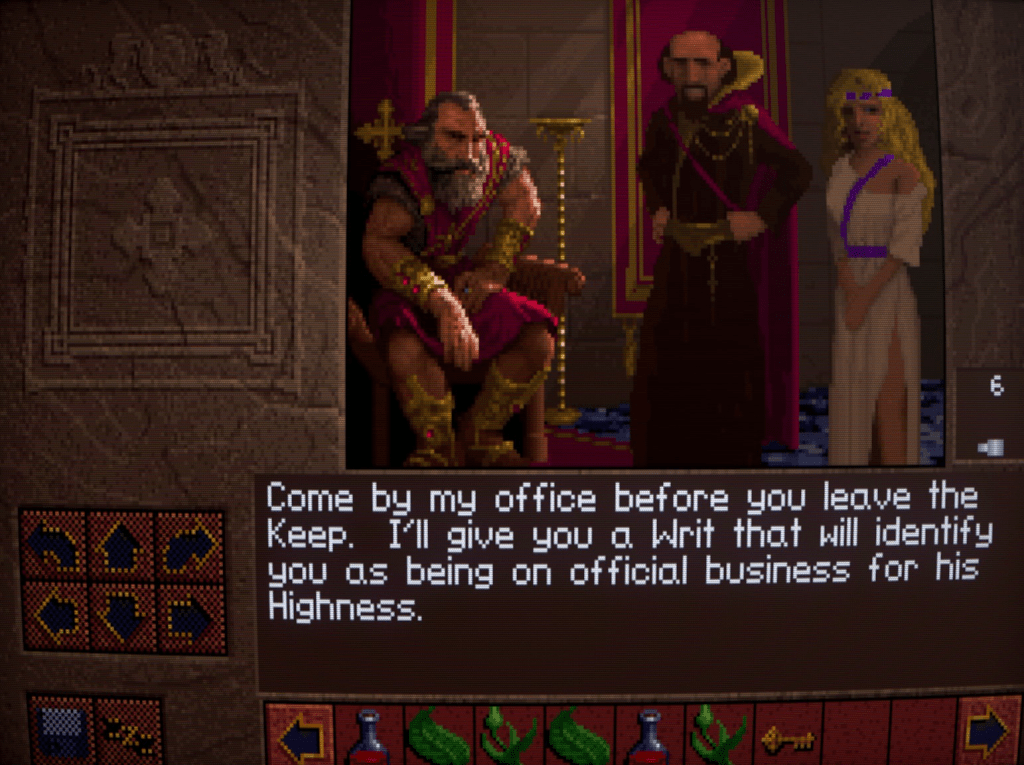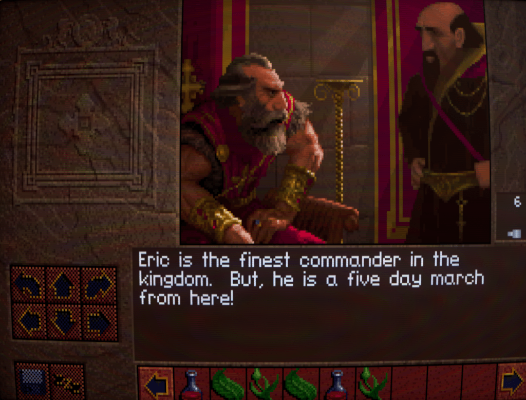 You’re free to wander about the castle before presenting yourself to Richard. Like EOB, your movement is tile-based and done through either the keypad or clicking on the arrows.