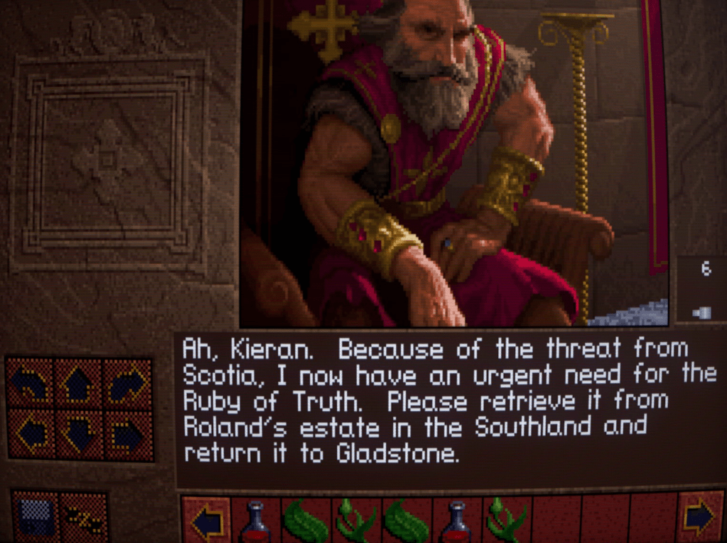 He seeks to employ the Ruby of Truth, renowned for giving sage advice in time of need. Currently, it lies in the possession of a trusted noble of the court, Roland. He instructs Kieran to travel to the Southland, retrieve it, and return it to Gladstone. The court advisor then requests that Kieran seek an official writ from him that will declare him to be on Royal Business.