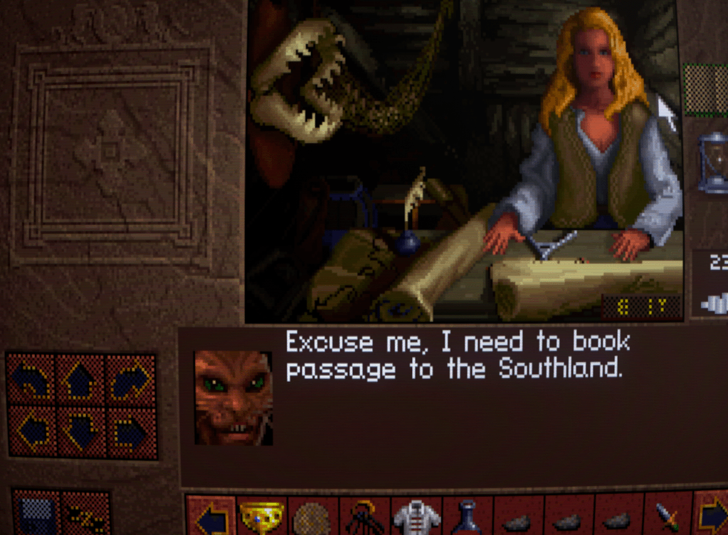 With the cave cleared of thugs and loot, it was time to head to the marina and book passage to the Southlands. Making his way through the now more-peaceful forest toward the lake, Kieran pushes open the door to the rustic, straw-roofed hut that served as an office for the ferrymaster.