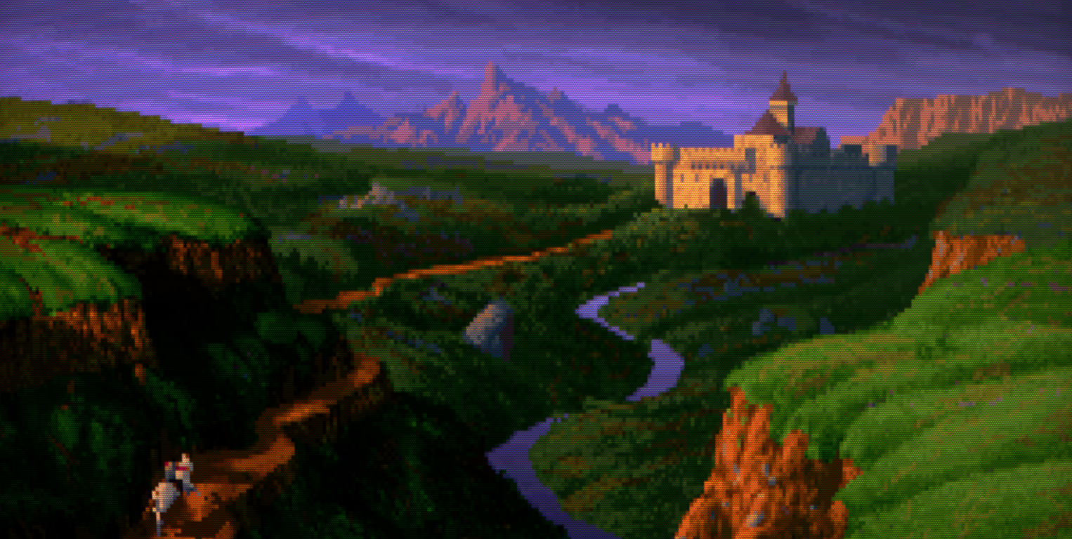 The game kicks off with an intro featuring some truly lovely medieval fantasy VGA pixel artwork. The evil witch Scotia, thwarted once before in her efforts to bring low Gladstone and its ruler, King Richard, now again hatches fresh schemes.