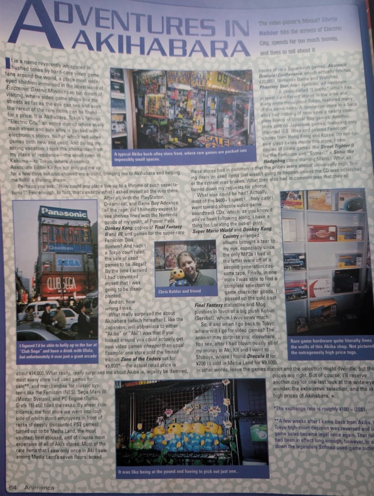 It’s been a long while since the last Pages from the Past, but I’m finally uploading another with a neat timepiece of a transcribed article. This one gives us a fascinating glimpse into Akiba’s video games scene in 2001 through the eyes and words of Chris Kohler, then already writing for a slew of tech, video games, and anime magazines for several years.